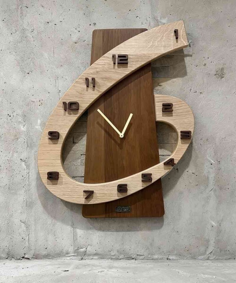 Sat koji izgleda kao da je neko dao umetničku dozu vremenu! Kombinacija tamnog i svetlog drveta sa krivudavim, zaobljenim oblikom čini ga potpuno drugačijim. Na ovom modelu su i brojevi rađeni od drveta.