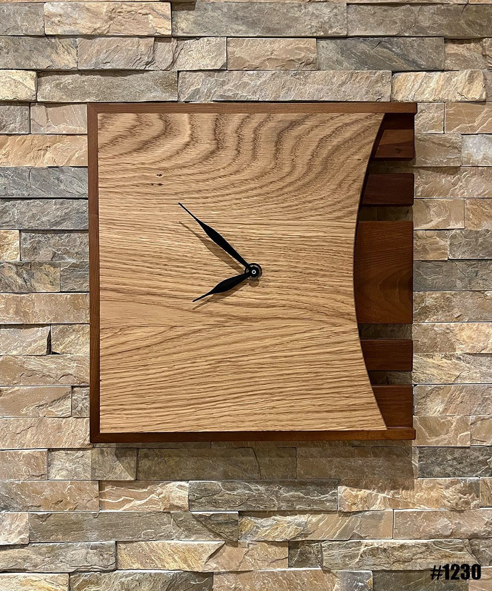 Svetli hrast sa živom teksturom – minimalistički i moderan. Kvadratni okvir od tamnog drveta okviri svetlu hrastovu površinu, dok crne kazaljke jednostavno “čitaju” vreme. Čista linija, bez brojeva – samo drvo i diskretne kazaljke.