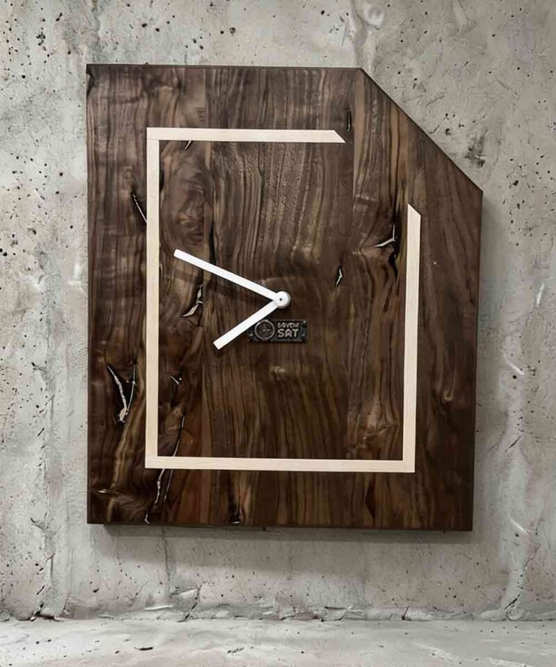 Orah sa bogatom teksturom i čvorovima čini osnovu, dok beli ram postavljen pod uglom daje iluziju dubine i pokreta. Bele kazaljke se lepo uklapaju u koncept. Drvo je zaštićeno providnim uljem koje naglašava neponovljive detalje oraha.