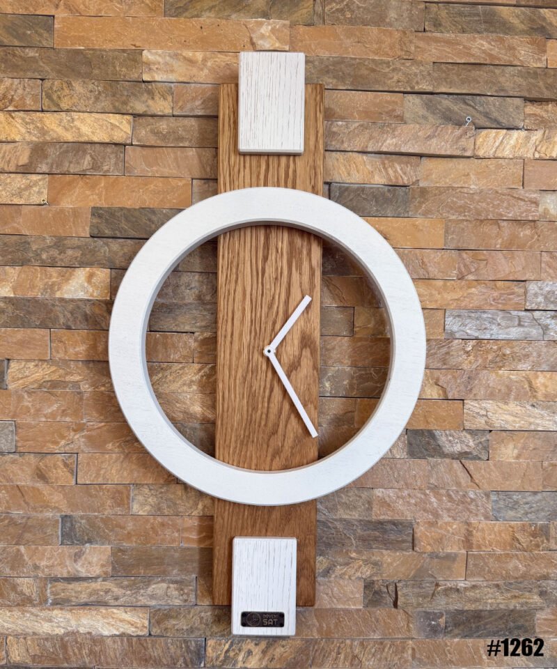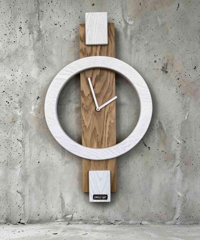 Sat koji izgleda kao da je dizajner stvarno mislio o detaljima. Beli prsten sa drvenim nosačem od hrastovine. Sat ima istaknute delove bojene u belo mat vrhu i dnu što ga čini kompletnim. Ovo nije samo sat – to je dekoracija koja radi i čini tvoj zid speciјаlnim i modernim.