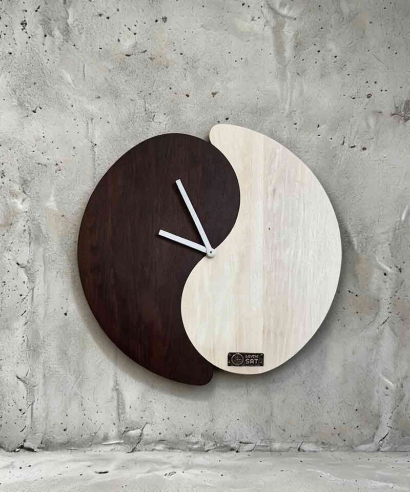 Dvobojni drveni zidni sat u obliku yin-yang simbola, spoj svetlog graba i tamnog parenog graba koji daje prirodnu, toplu estetiku. Minimalističke bele kazaljke i diskretan dizajn čine ga pogodnim za dnevne sobe, kancelarije i moderne enterijere.
