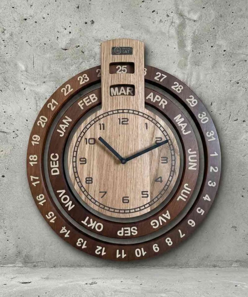 Idemo još luđe. Večiti kalendar sa danima u nedelji i sat. 2u1. Definitivno nesvakidašnji poklon. Sve realizovano u kombinaciji hrasta i tamnog parenog graba. Ova verzija ima jedan prsten manje ali zato ima mnogo veći sat sa brojevima i podeocima.