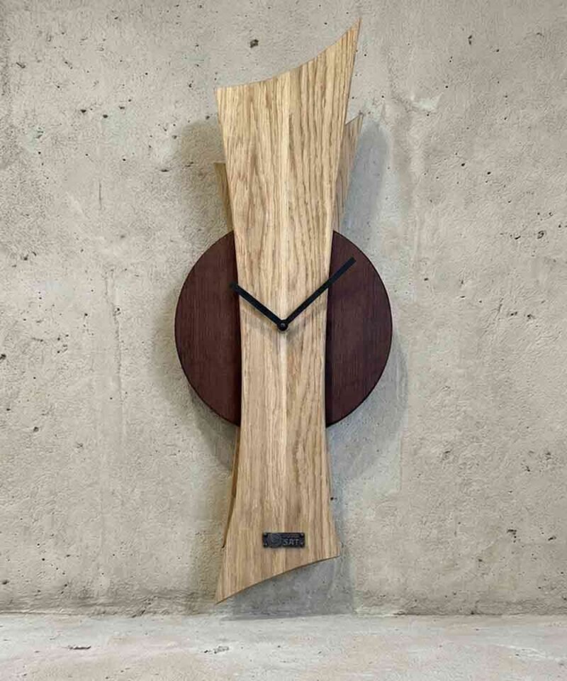 Sat koji kombinuje umetnost i funkcionalnost na odličan način. Svetli hrast ide kao vertikalna linija kroz celi sat, a tamni okrugli deo od parenog graba sa crnim kazaljkama je u sredini. Izgleda kao da je neko dao malo Zen-a u dizajn – minimalistički ali sa karakterom. Odličan je za moderne sobe, kancelarije ili bilo gde voliš nešto drugačije.