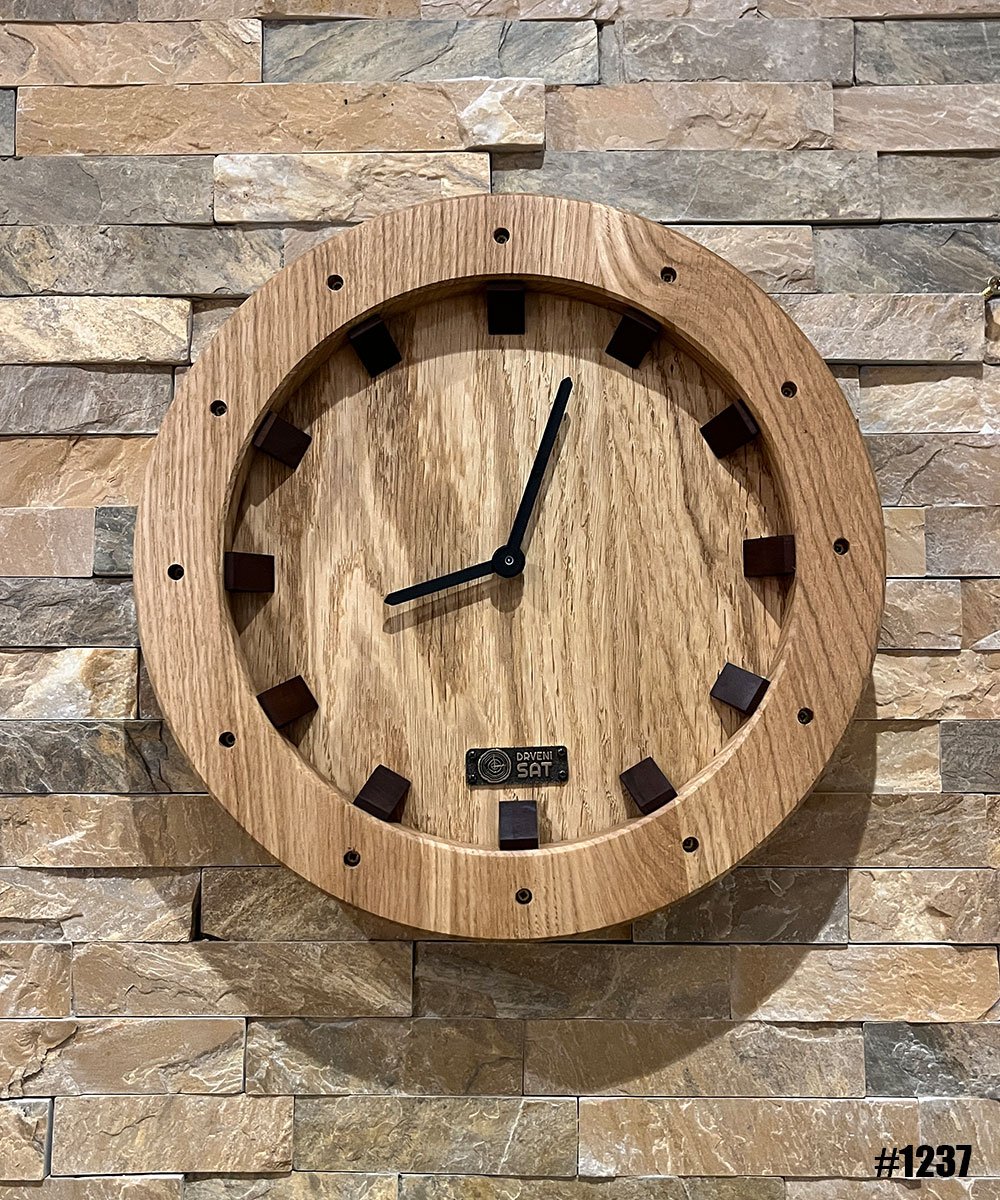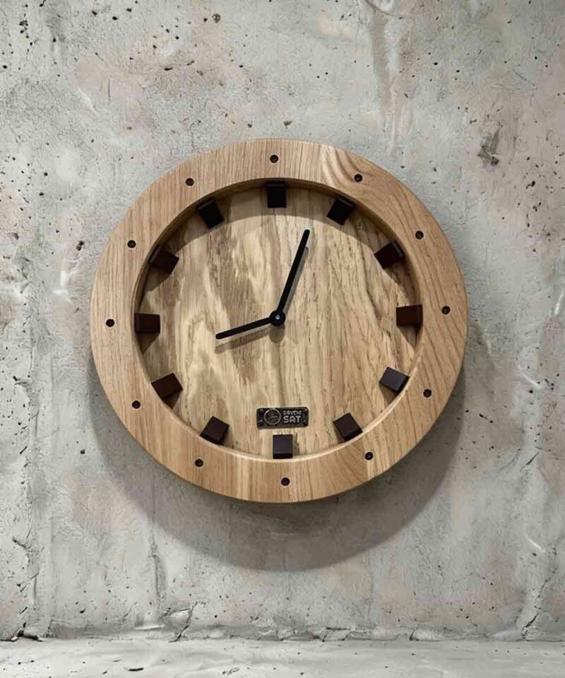 Okrugli zidni sat od masivnog hrasta sa izraženom teksturom drveta, tamnim drvenim indeksima i minimalističkim crnim kazaljkama. Topao, skandinavski dizajn za dnevne sobe i kancelarije. Moguća su dimenziona prilagođenja po želji.