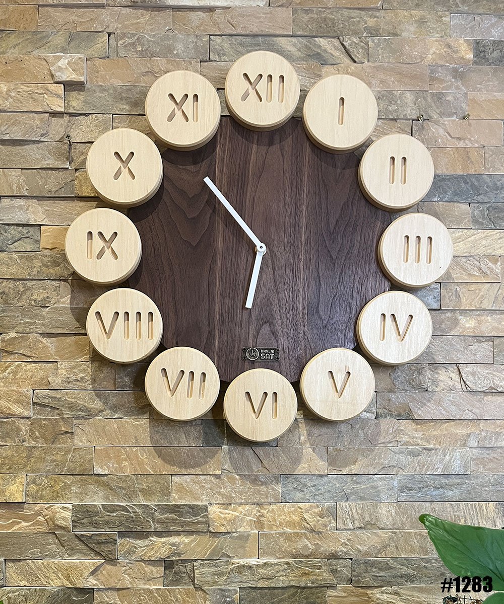 Sat koji izgleda kao da je sastavljen od malih drvenih kružića! Tamna drvena osnova od oraha ima 12 svetlih drvenih kružnih komada raspoređenih oko njega, svaki sa rimskim brojevima. Svaki krug je malo izbačen van što daje satu 3D efekat. Rimski brojevi daju mu klasičan izgled. Ovo je sat koji izgleda skupo i neobično – nešto što će zadiviti sve.