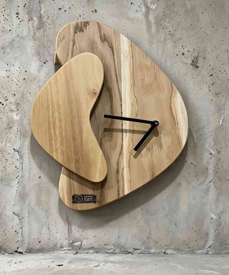 Ručno rađen drveni zidni sat u obliku meseca. Topli tonovi drveta i jednostavne crne kazaljke čine ga lepim dodatkom za dnevnu sobu ili dečiju sobu.