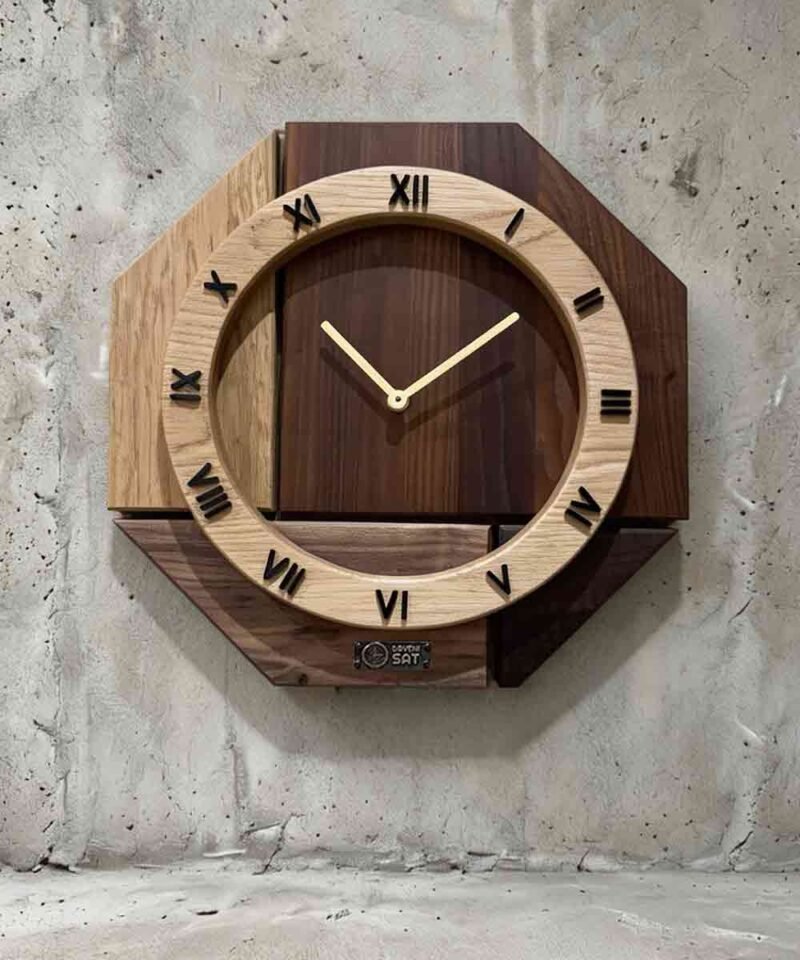 Neobičan sat od drveta koji spaja svetle i tamne tonove. Dekorativni zidni sat koji izgleda kao pravi mali drveni mozaik. U sredini je prsten sa rimskim brojevima. Ovo je jedan od onih modela za one koji ne mogu bez brojeva.