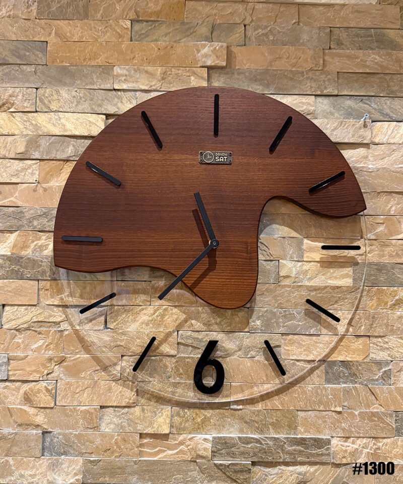 Tamni pareni jasen u spoju sa providnim kliritom. Spoj koji omogućava da se vidi deo pozadine zida na koji je sat postavljen.