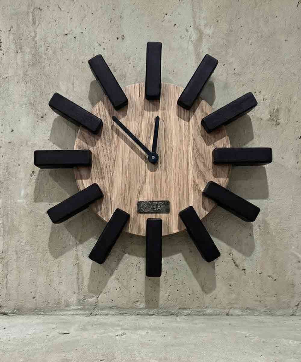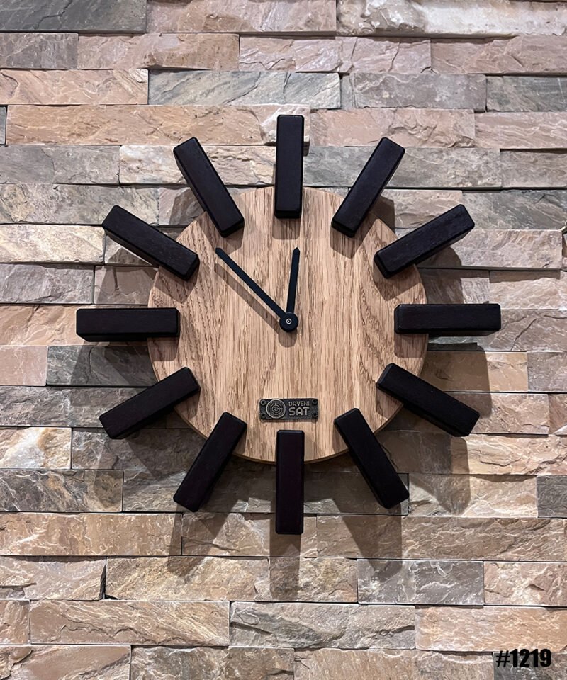 Moderan zidni drveni sat “Propeler” sa jedinstvenim dizajnom. Izrađen od hrastovine sa podeocima od tamnog parenog oraha. Zbog svoje veličine zgodan je za manje prostore. Prirodna lepota drveta očuvana je mat voštanim uljem.