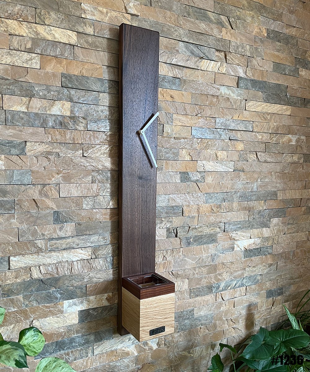 Ručno rađeni sat sa izduženim vertikalnim oblikom. Perfektna kombinacija tamnog oraha i svetlog drveta hrasta. U dnu sata se nalazi i mala saksija koja ima u sebi i plastični uložak za biljku te biljka može direktno da se sadi. 2 u 1 koncept.