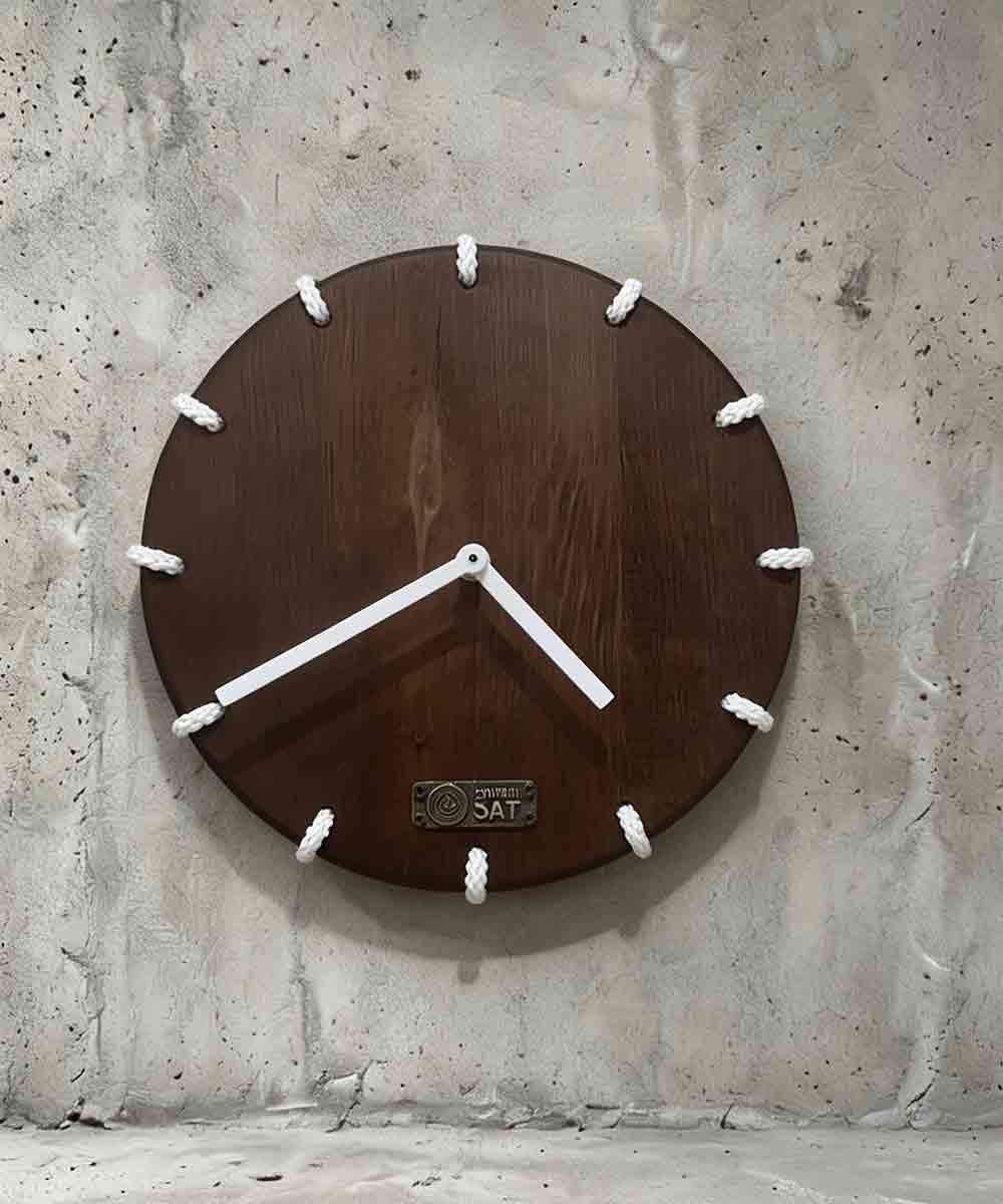 Ručno rađeni sat od prirodnog tamnog drveta parenog graba. Na svakom punom satu nalazi se beli detalj od kanapa a bele kazaljke jasno pokazuju vreme. Mali sat koji može stati bilo gde.