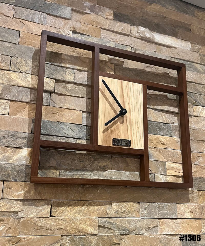Moderan zidni sat — ručno rađen drveni ram u tamnijem tonu parenog graba sa centralnim delom rađenim od svetle hrastovina i minimalističkim crnim kazaljkama. Geometrijski dizajn koji se uklapa u jednostavnost i toplinu prirodnog drveta.