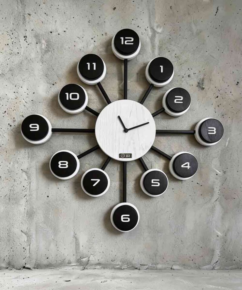Istovremeno i masivan i tanan. Dominiraju brojevi uradjeni na tamnom termotretiranom orahu koji daje dopadljiv kontrast na belo bojenim delovima.